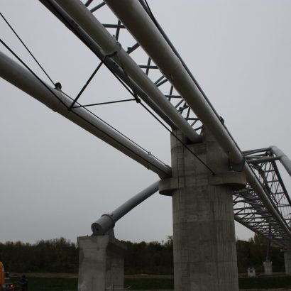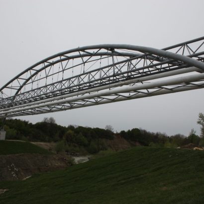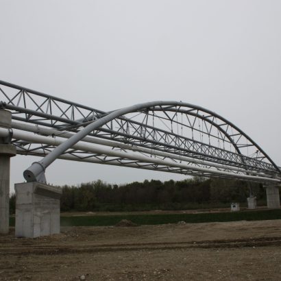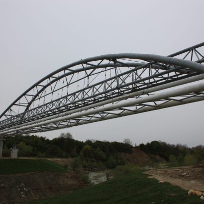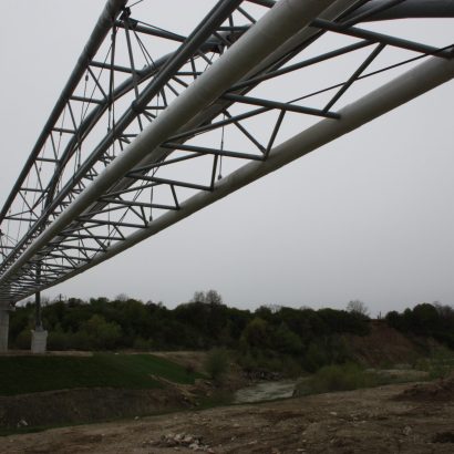 Proiectul a implicat construirea și instalarea structurilor de suport și a unei suprastructuri metalice, incluzând arcuri metalice și sistemele de susținere. De asemenea, a fost amenajată albia râului, asigurând o infrastructură robustă și funcțională pentru traversarea râului.